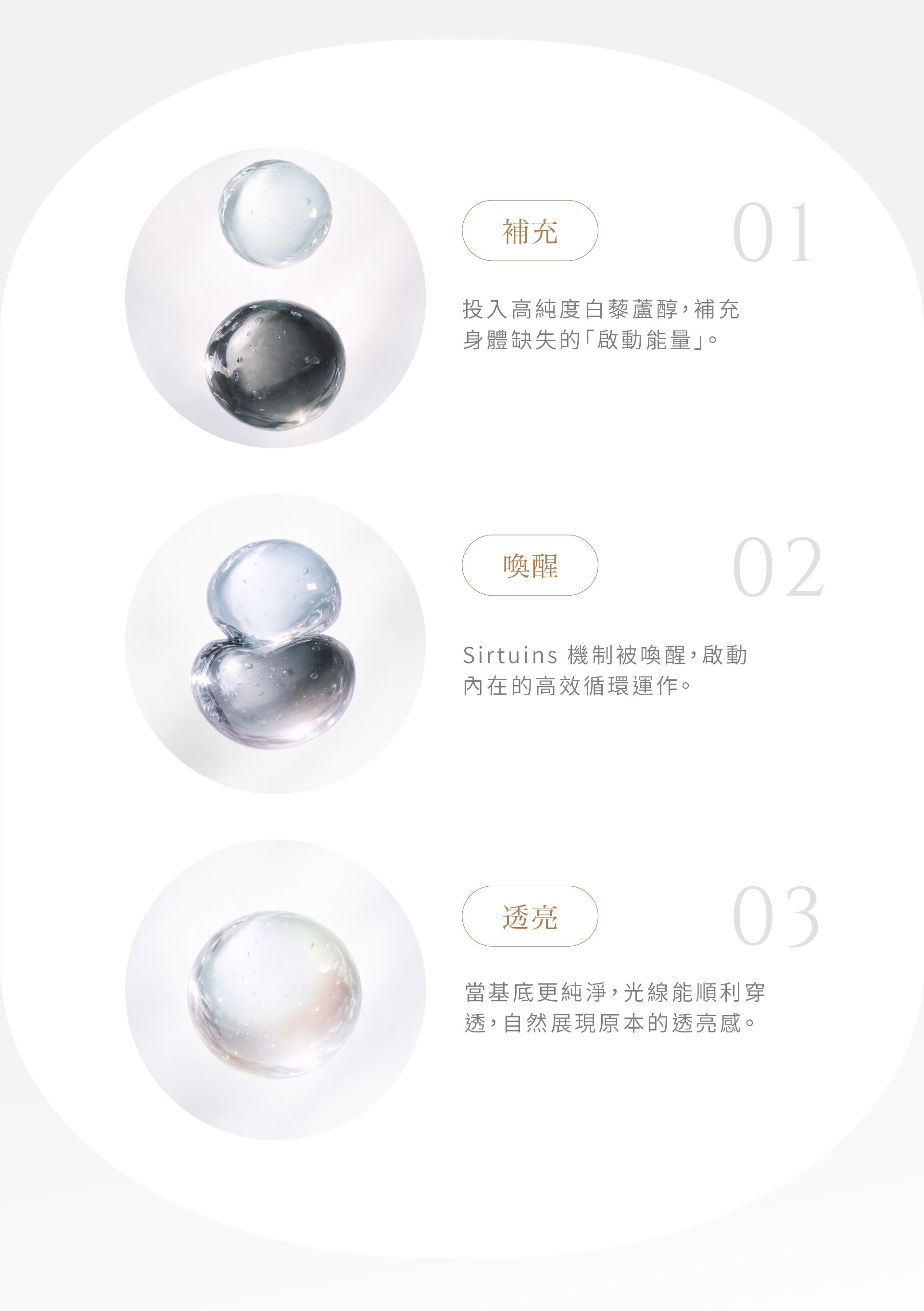 深度整合 Veri-te™ 98% 高純度白藜蘆醇 與 ButiCTP® 海洋三胜肽,分別作用於 Sirtuins 青春因子 與膠原結構。透過高濃度活性成分的科學配比,觸發內源性協同效應(Synergistic Effect),支持化肌膚穩定度與光澤表現。
